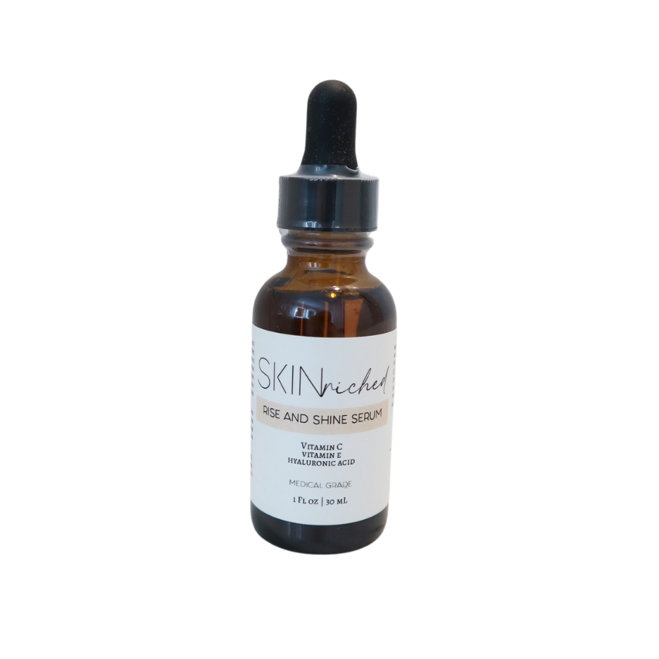 Our rise + shine serum is the perfect morning serum! this highly potent serum contains 15% l-ascorbic acid (vitamin C) + 1% tocopherol (vitamin E) + 0.5% ferulic acid + hyaluronic acid + peptides. Additionally, we’ve added a special trans-epidermal carrier that allows the ingredients to penetrate deep into the skin.