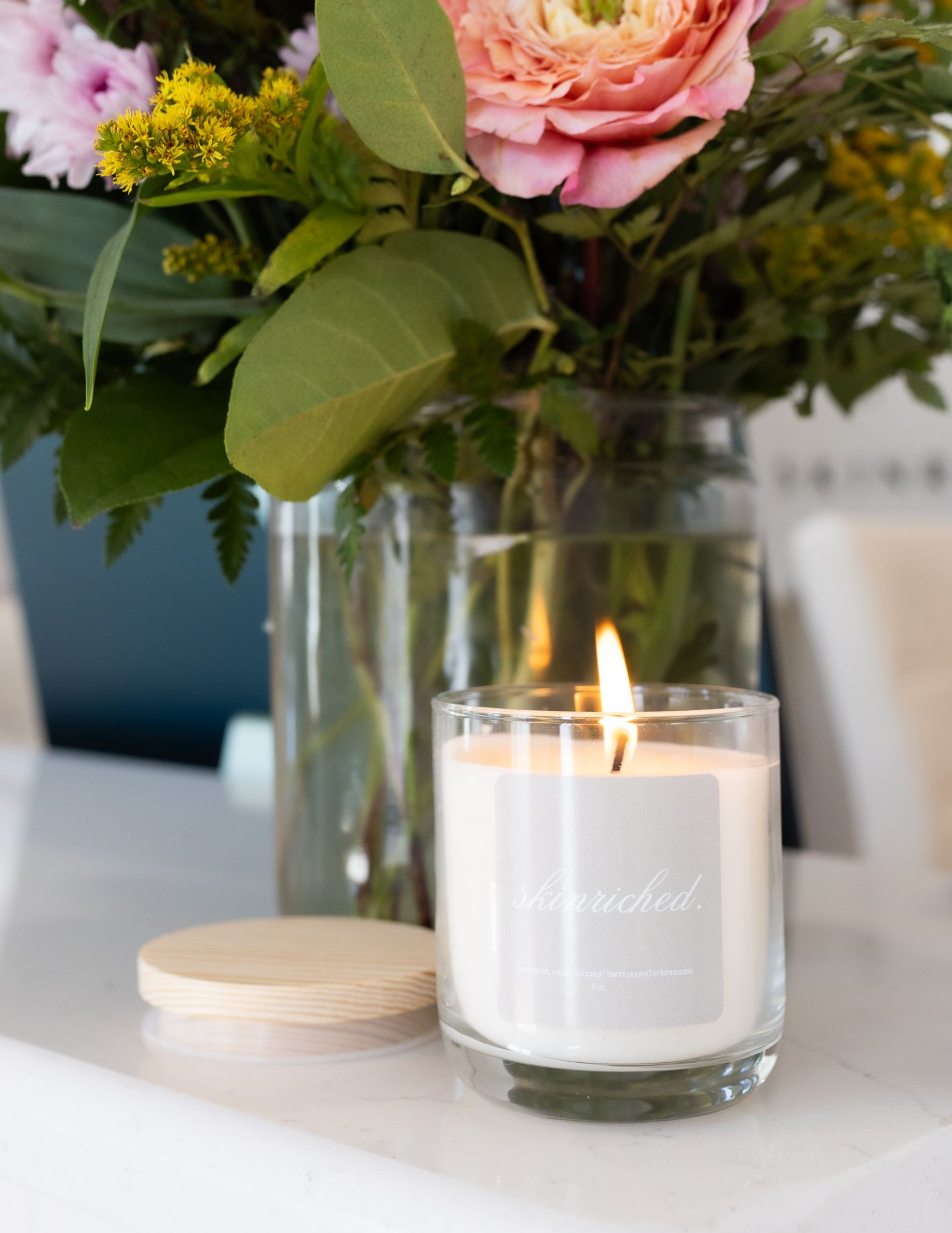 The SKINriched Signature Candle is the scent you know and love the moment you walk through our doors, now available for your space. Bright bergamot, warm musk, and creamy coconut blend together for a clean, soft, elevated fragrance that feels both cozy and luxe. Hand poured in Tennessee, this 8 oz candle is the perfect way to bring a little SKINriched into your everyday routine. Light it, unwind, and let your home smell like your favorite place.